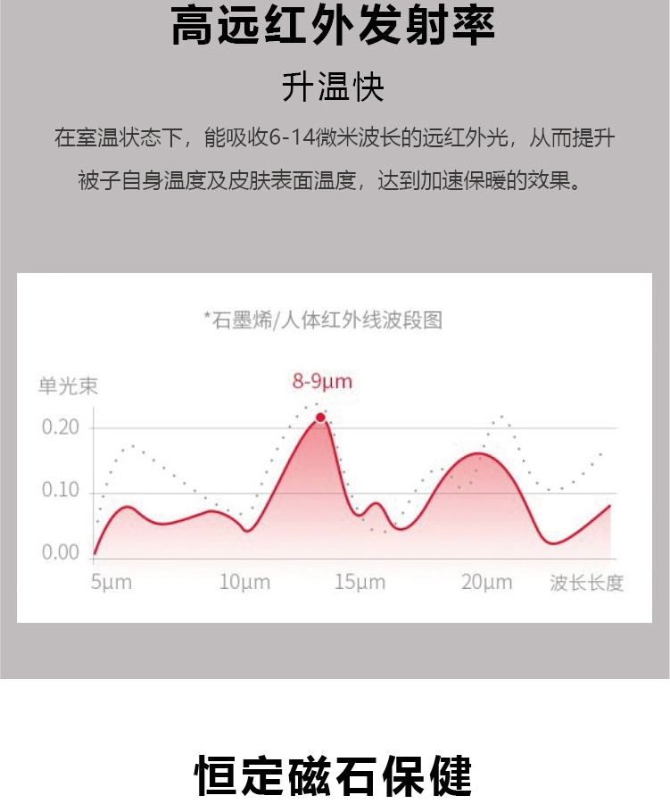 描述:石墨烯磁能复合被一款能给你带来健康的被芯,采用石墨烯功能棉填充,具有很好的抗菌抑菌、防静电及远红外发热保暖效果,恒定磁石让您整晚“沐浴”磁场中,为身体充能,分仓填充设计,被子不易成团跑棉更整洁耐用。