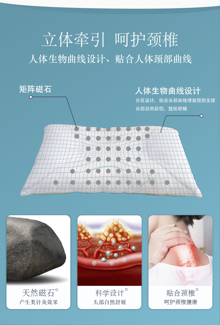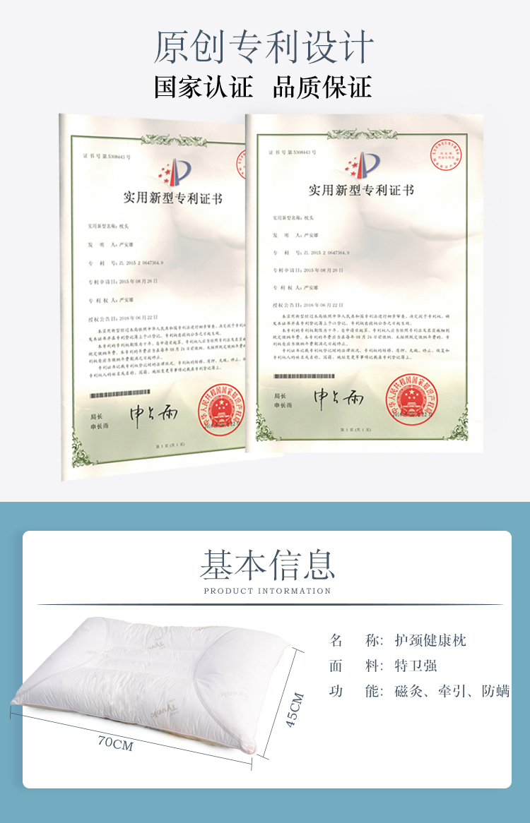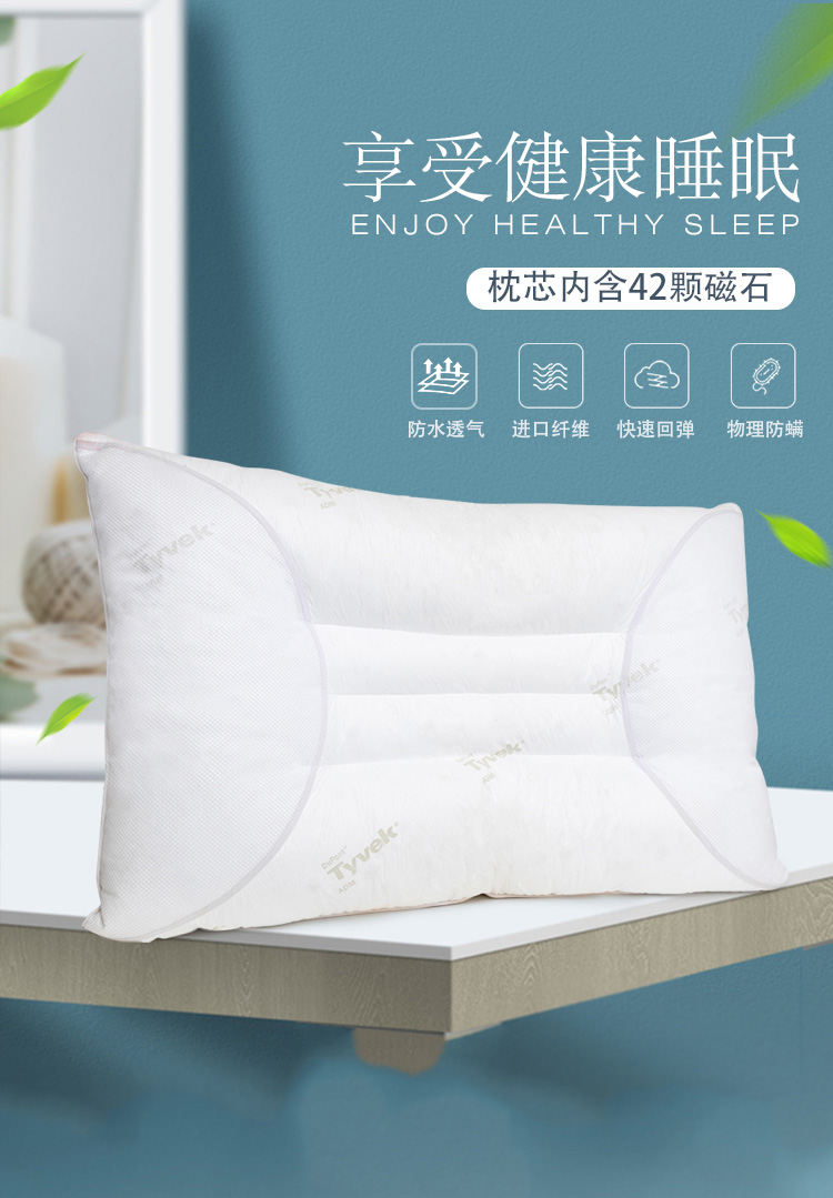描述:专利产品,采用进口特卫强面料,透气防螨、具有99%超强的防螨效果,内部填充生物磁石,能刺激颈部穴位,呵护睡眠