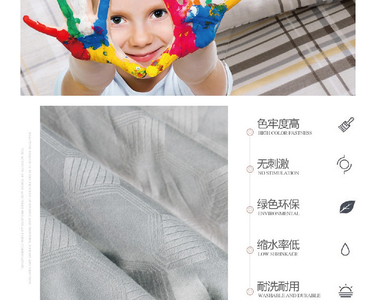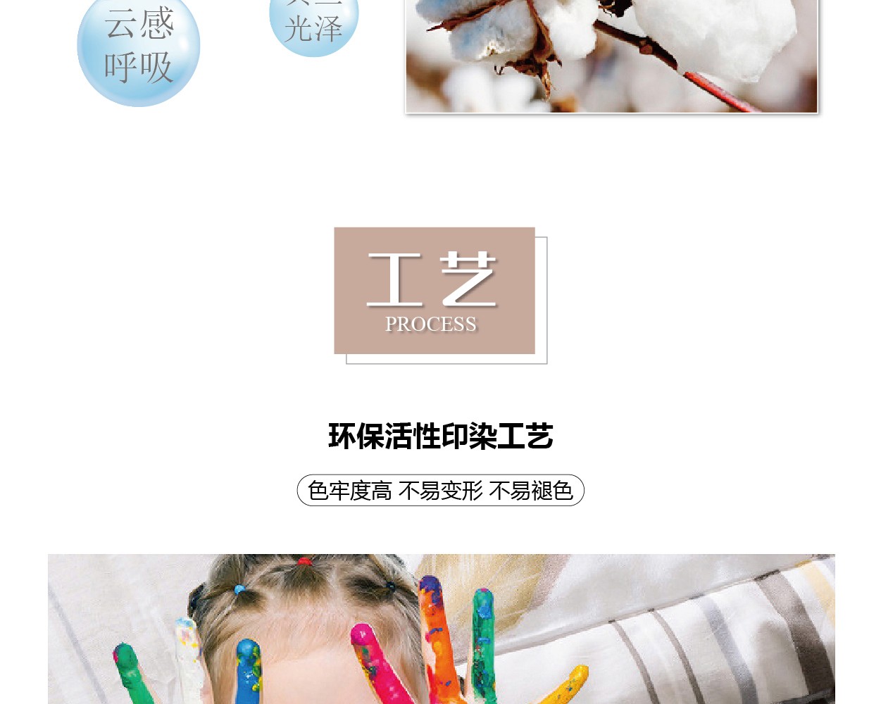 描述:面料使用环保印染处理,有不易退色,不起球等特点,无刺激性气味,小孩也能放心舒睡,100%纯棉面料,精致的提花工艺,让图案更美观,面料更加柔滑,尽显时尚品味。