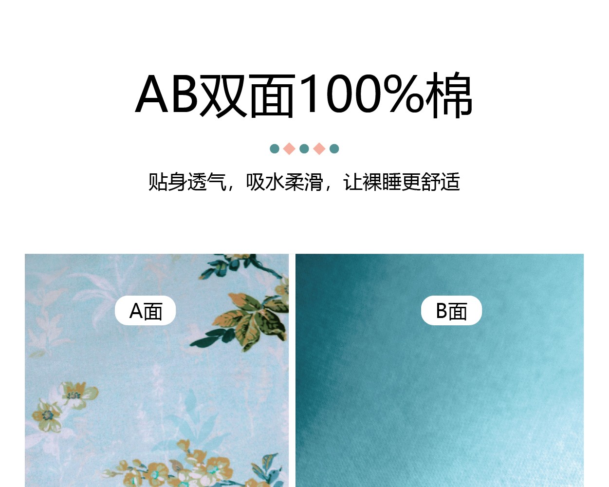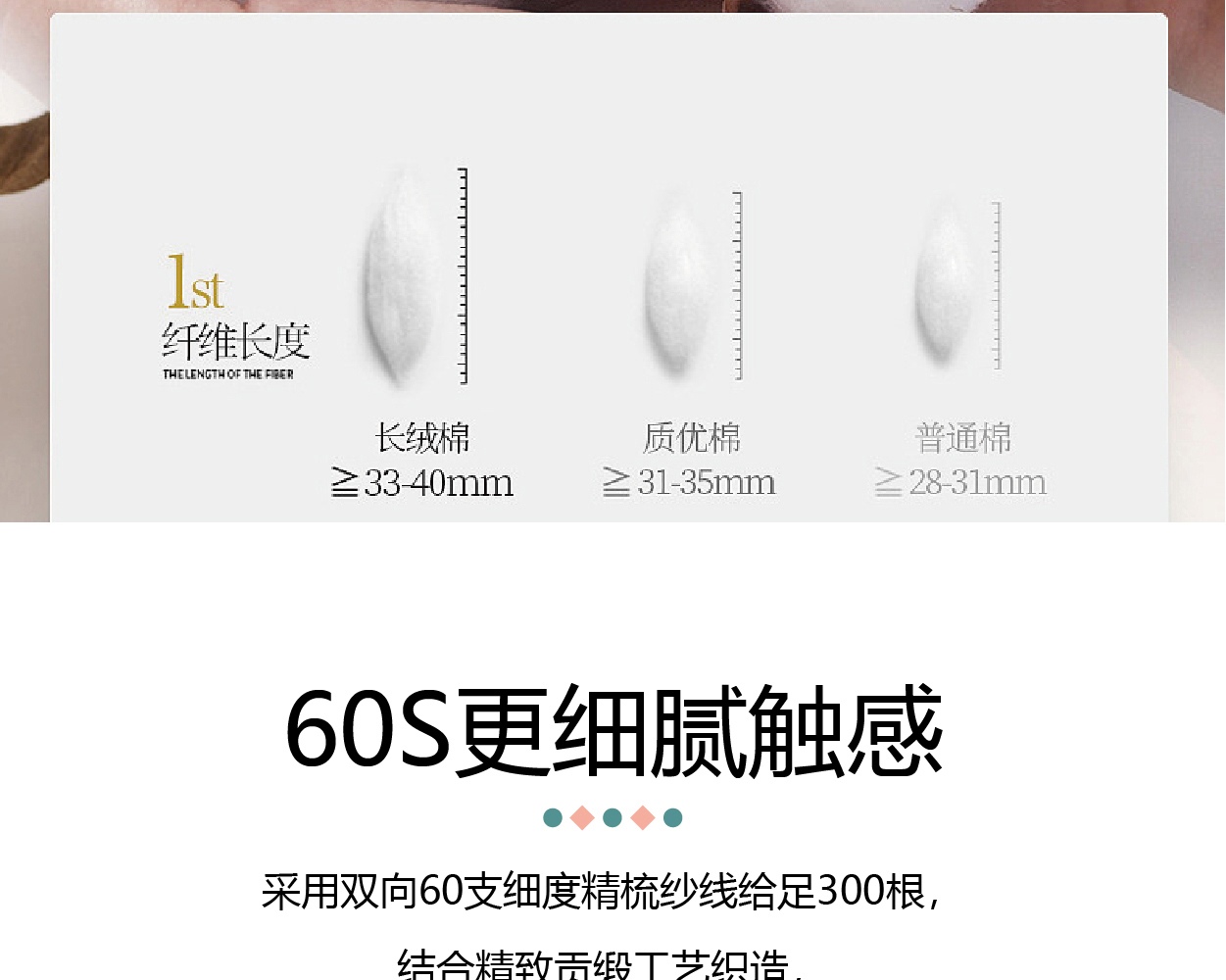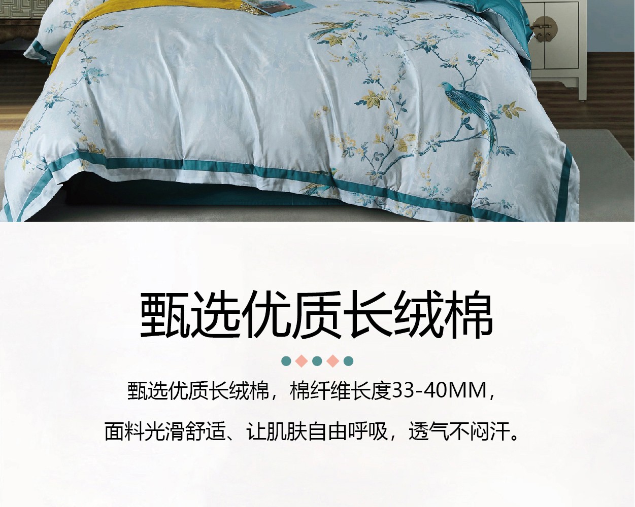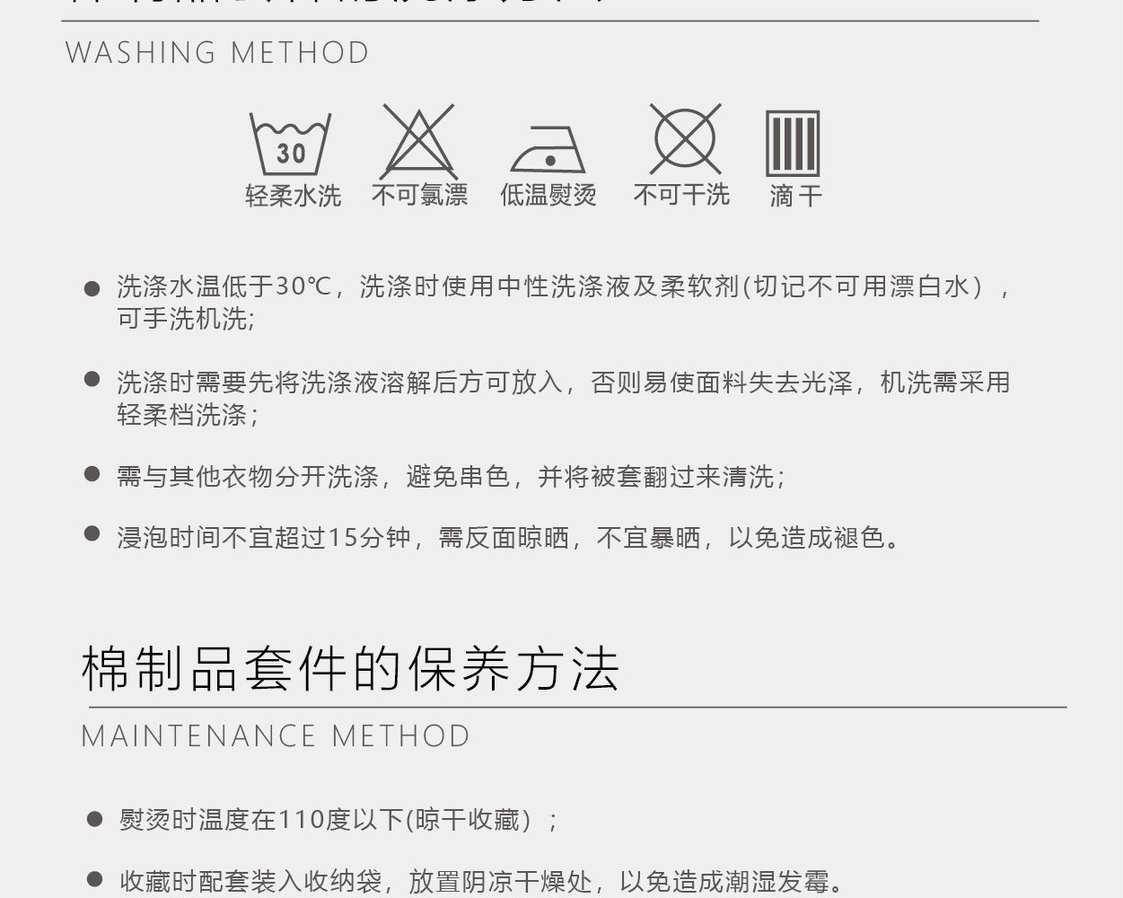 描述:60S天然纯棉面料,如软纯粹,细腻亲肤 织造面料的每一根纤维选取长度均大于30mm,精梳去除粗纤维,无任何断线起球。 安全环保印染工艺,让你睡得更放心,带给您舒适的睡眠体验