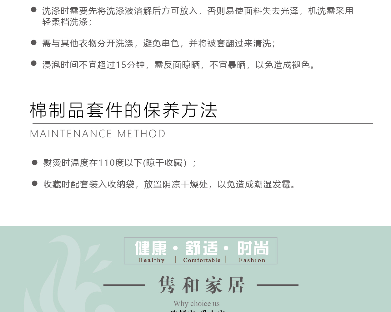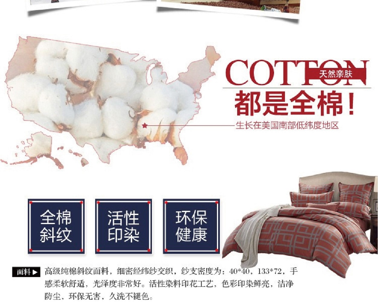 描述:采用新疆长绒棉,环保印染工艺,温馨舒适有格调和品味,布料细腻、柔滑.不脱色,不变形,亲肤性很好