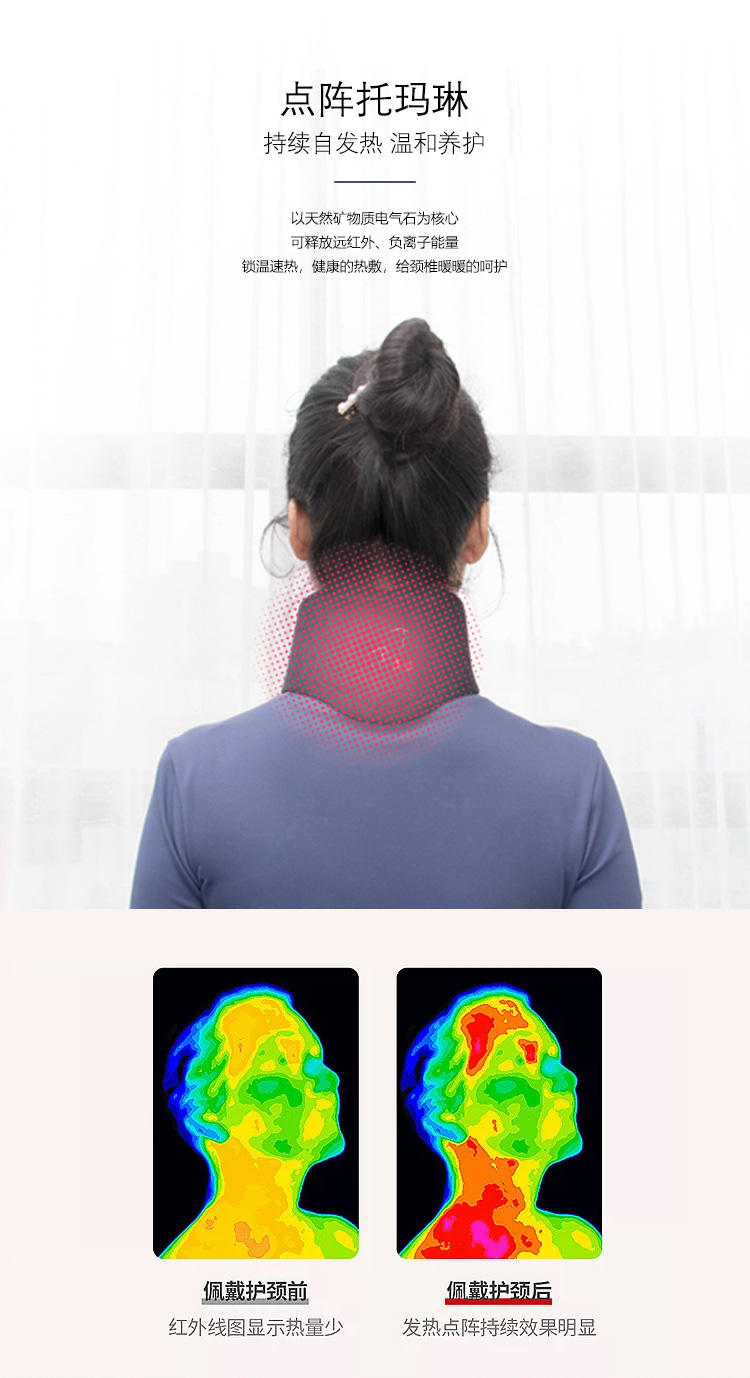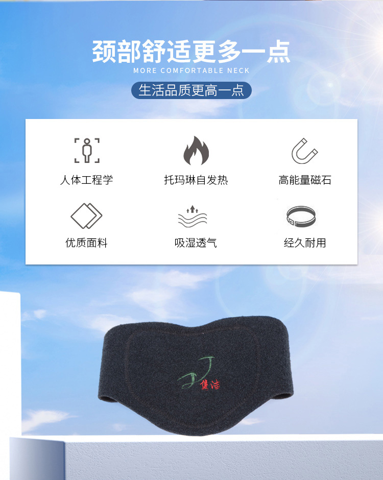 描述:内嵌5颗恒定磁石,以天然矿物质电气石为核心,可释放远红外、负离子能量,锁温速热,健康的热敷,给颈椎暖暖的呵护