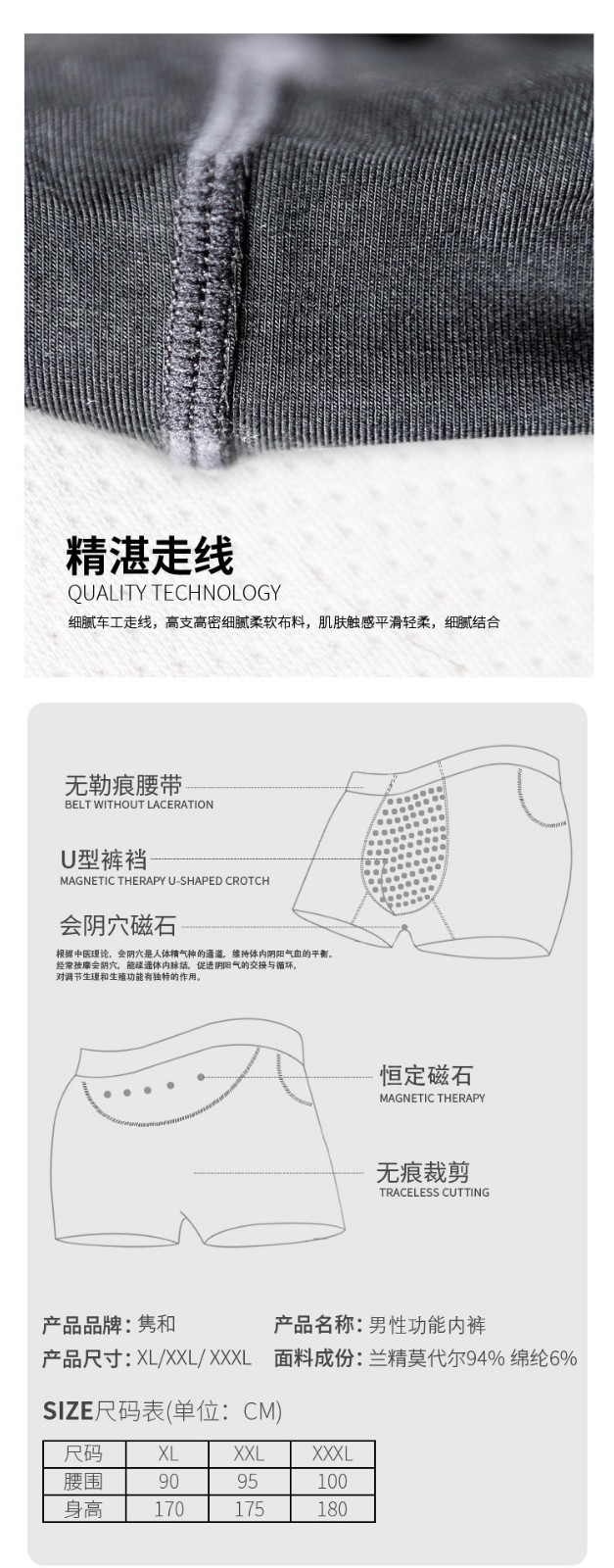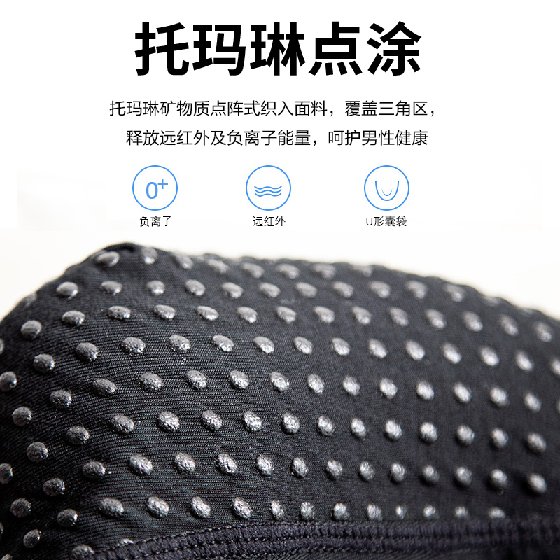 描述:进口兰精莫代尔再料,内镶36颗磁石,24小时释放磁能量。U型囊袋设计,让三角区更加宽敞,托玛琳养护、抑菌、防辐射、舒适透气,更能解决男人的难言之隐。