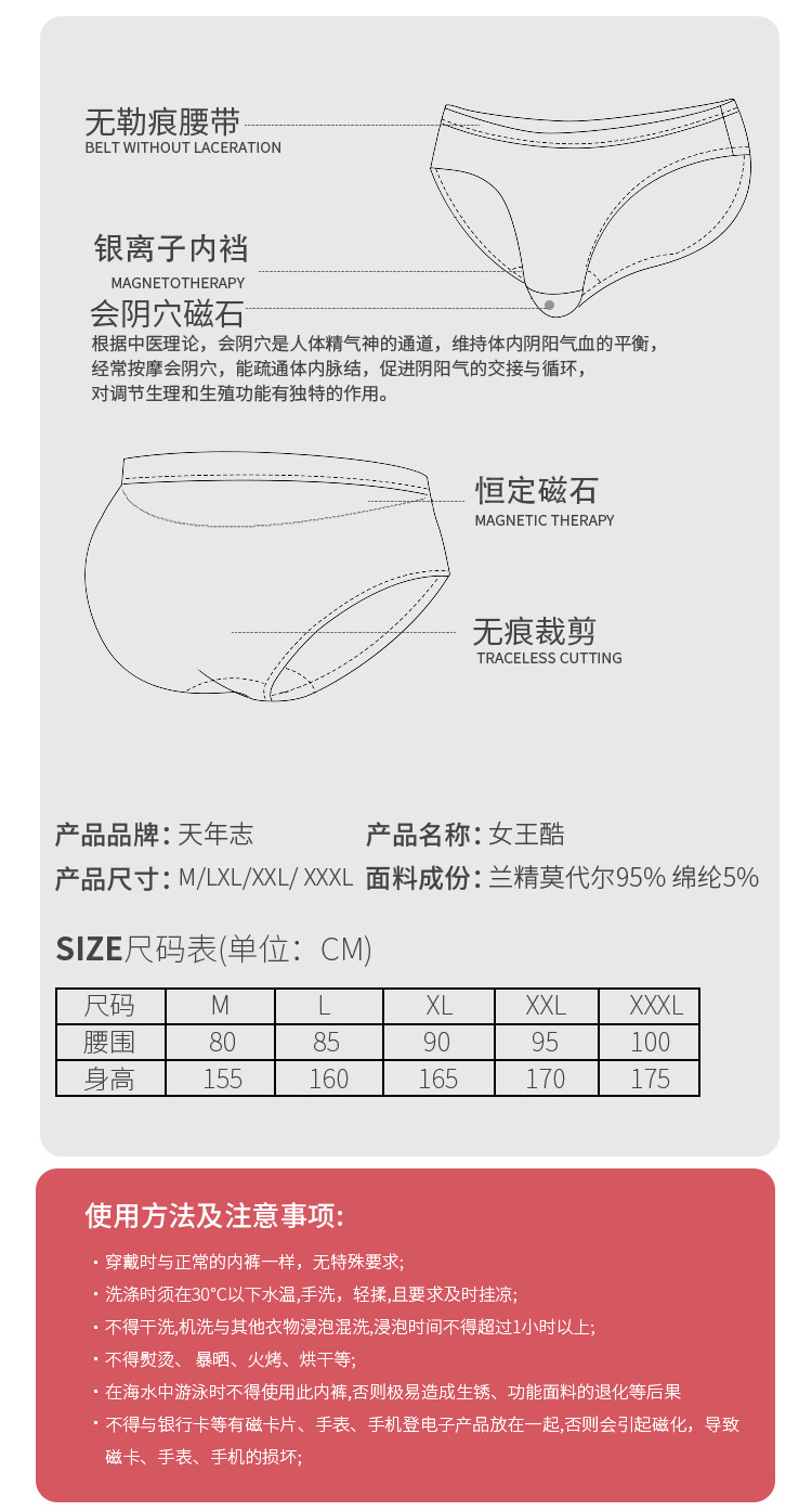 描述:穿上女王酷、枯木逄春生。强力抑菌护私密、妇科炎症少惹你。 磁灸会阴穴,少得归科病。提臀护腰腹,蕾丝勒无痕。