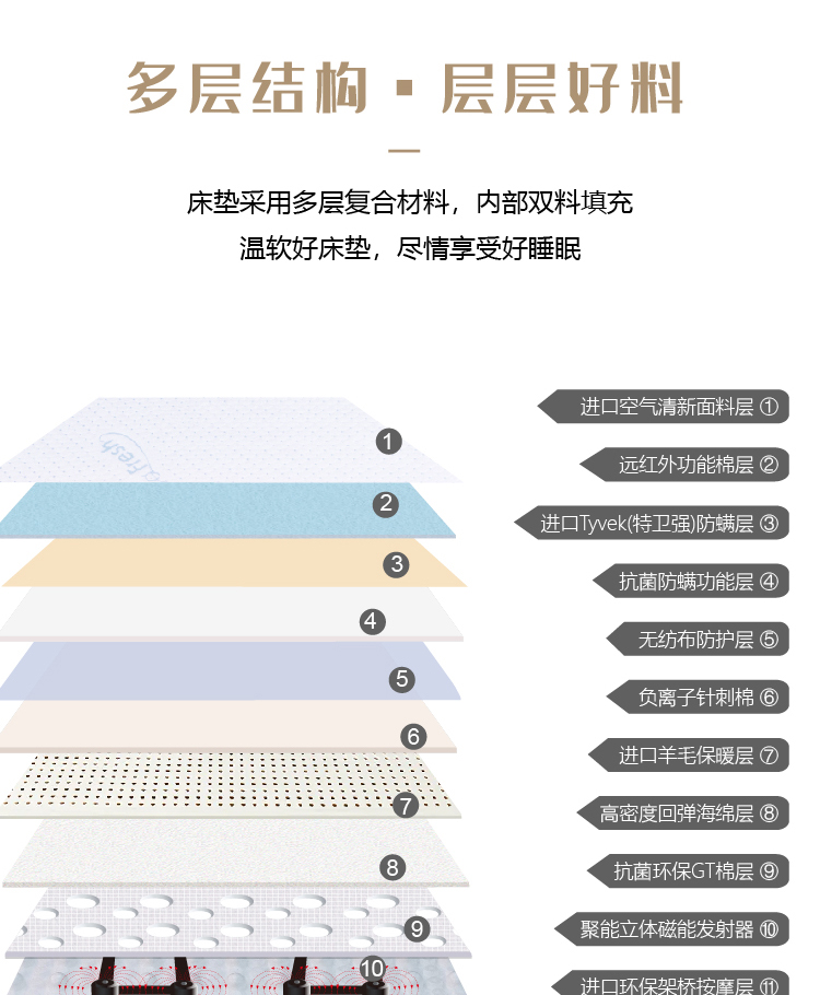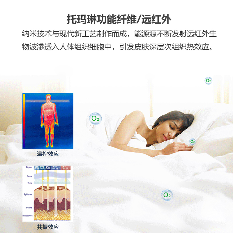 内芯材质:远红外功能层、恒定能量磁场层、进口环保架桥按摩层、抗菌防螨功能层