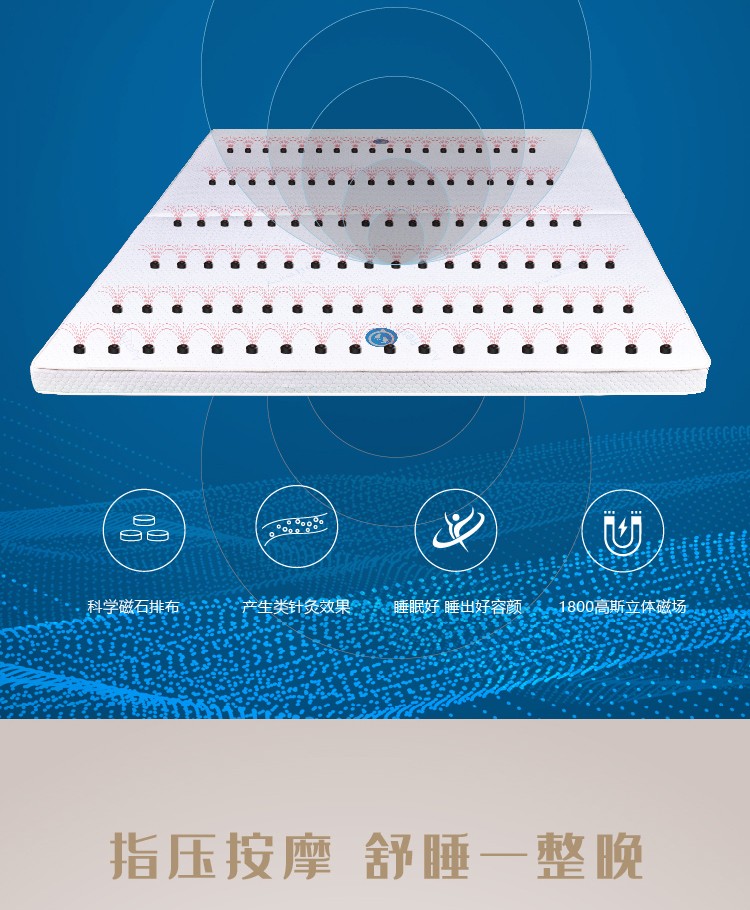 描述:床垫采用托玛琳功能层、恒定能量磁场层、进口环保架桥按摩层、抗菌防螨功能层等13层复合材料结构、400颗磁石、100个磁架形成聚能立体磁场组,产生恒定磁场、符合弹性按摩垫、突球型设计人躺在上面能持续享受类指压按摩效果,竹炭纤维吸附身体产生的异味辅助负氧离子让卧室跟清新,让你尽情享受好睡眠。