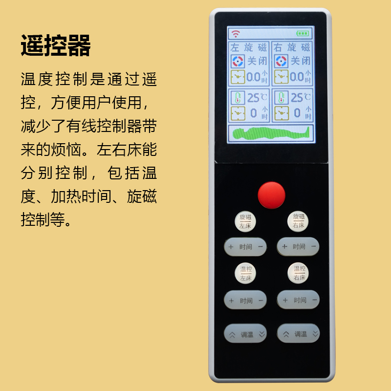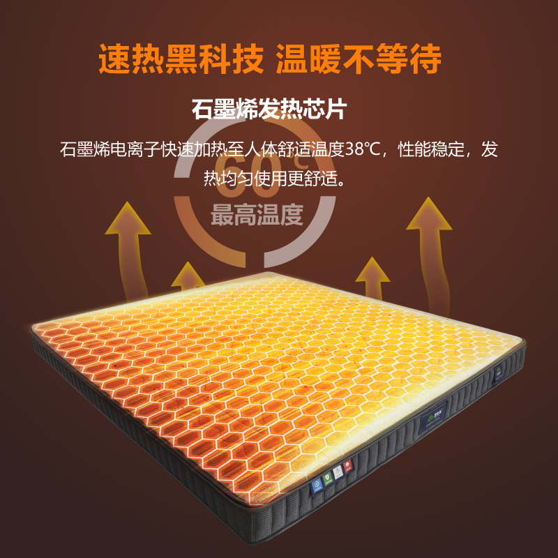 描述:床垫采用旋磁发射器、恒定能量磁场层、石墨烯发热层、负离子释放层、高密度棉等多层复合材料结构,床垫左右分区,可自由在旋磁和静磁方面调节。石墨烯电离子快速加热至人体舒适温度38°C。温软好床垫、不仅睡得舒适,还能发射磁及远红外负离子、让你在睡眠中被动养生,尽情享受好睡眠。